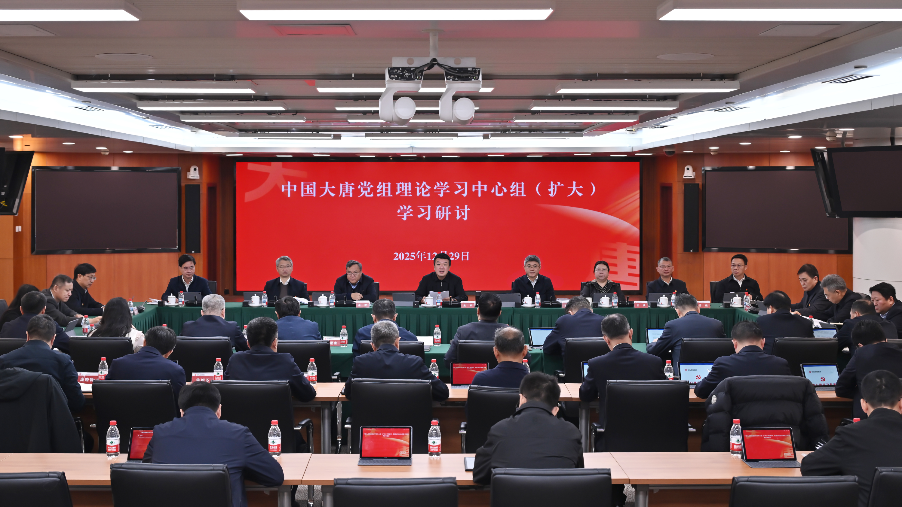 12月29日,中国大唐集团有限公司举行党组理论学习中心组(扩大)学习研讨,紧紧围绕习近平总书记对中央企业工作作出的重要指示精神,紧密结合学习贯彻党的二十届四中全会精神和中央经济工作会议精神,牢牢把握“十五五”窗口期,聚焦国家能源政策机遇,用好“两个途径”,发挥“三个作用”,为基本实现社会主义现代化贡献大唐力量。
